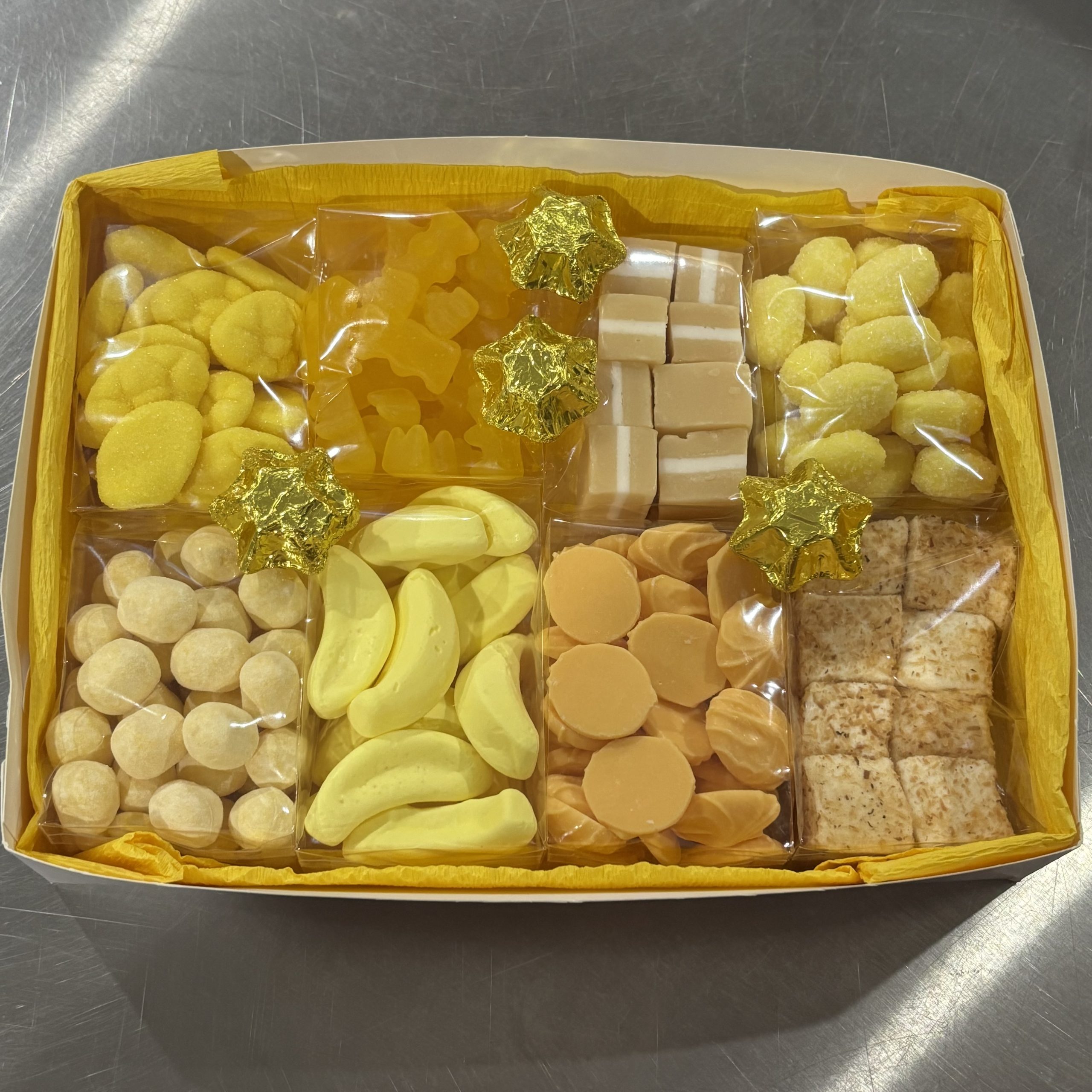 This box consists of an assortment of yellow coloured confectionery. This box is a great size for parties, celebrations or gifting!