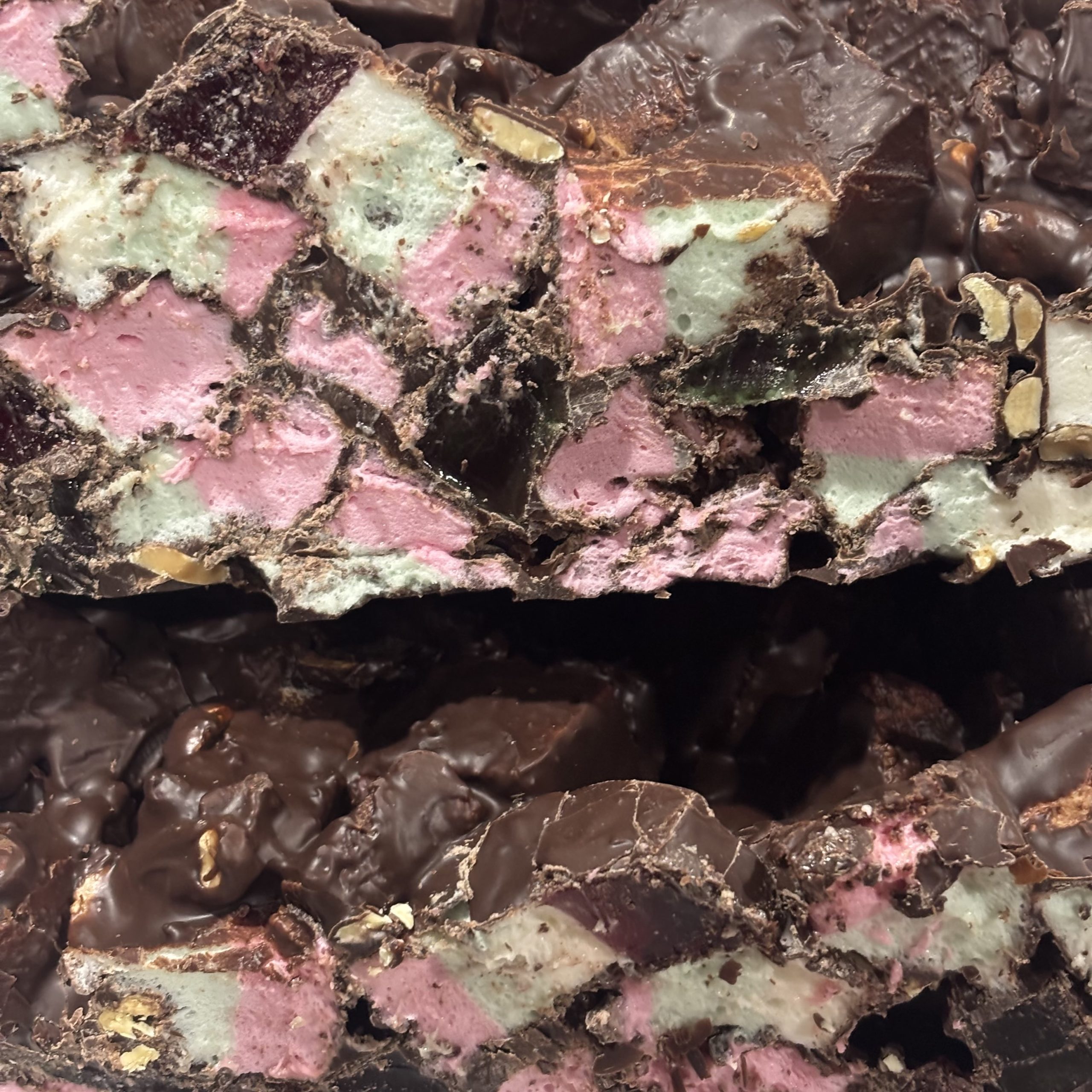 Dark Chocolate Rocky Road made with fluffy sweet marshmallows, nuts, delicious chewy and soft jubes in all sorts of colours and flavours and smothered in rich, smooth dark chocolate.
