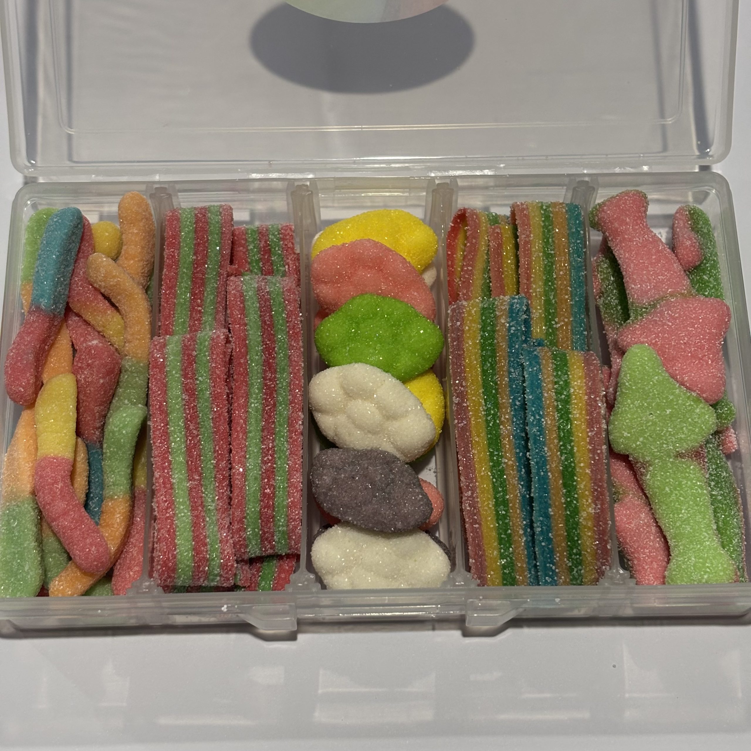This snack box consists of an assortment of sour lollies in a variety of flavours. These are perfect for travelling, gifting or for a delicious snack!